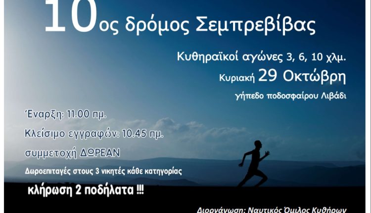 Ο Ναυτικός όμιλος Κυθήρων διοργανώνει την Κυριακή 29 Οκτωβρίου 2017 και ώρα 11:00 πμ. τον 10ο δρόμο της Σεμπρεβίβας σε ασφάλτινες διαδρομές 3, 6 & 10 χλμ.