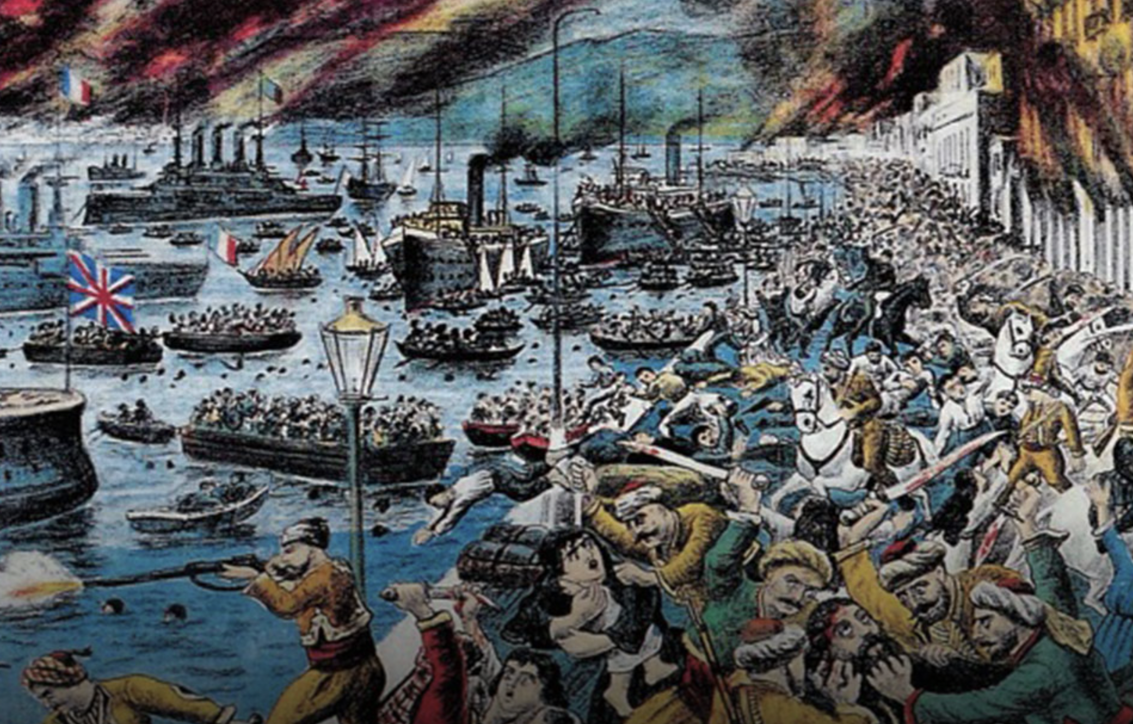 Εις πλείστα σημεία της τραγικής παρατάξεως των συγκεντρωμένων εις την παραλίαν, έπιπτον τεμάχια καιομένων δοκών μεταδίδοντα το πυρ, όπερ όμως δεν εξηπλούτο, των καιομένων πραγμάτων ριπτομένων εις την θάλασσαν.
