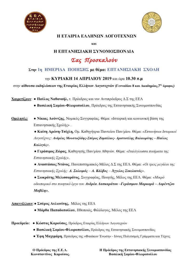 Εκδήλωση με θέμα «ΕΠΤΑΝΗΣΙΑΚΗ ΣΧΟΛΗ – ΠΟΙΗΣΗ & ΛΟΓΟΤΕΧΝΙΑ» από την Επτανησιακή Συνομοσπονδία και την Εταιρία Ελλήνων Λογοτεχνών