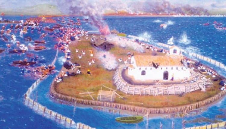 “Εσήκωσεν η φρουρά λοιπόν γύρωθεν της Εκκλησίας οχύρωμα έως 5 πόδας (περ. 1,7μ.) και έως 6 (περ.2 μ.) το ύψος. Ο τάφρος γύρωθεν έμεινε τόσον ανοικτός, όσον χώμα έλειψεν… Εστάλησαν και 2 πυροβόλα των 18 λίτρων και 2 μικρά των 6 και τα μεν δύο έστησαν (βλέποντας) κατά τα νησίδια, τα δε κατά το Μεσολόγγι”.