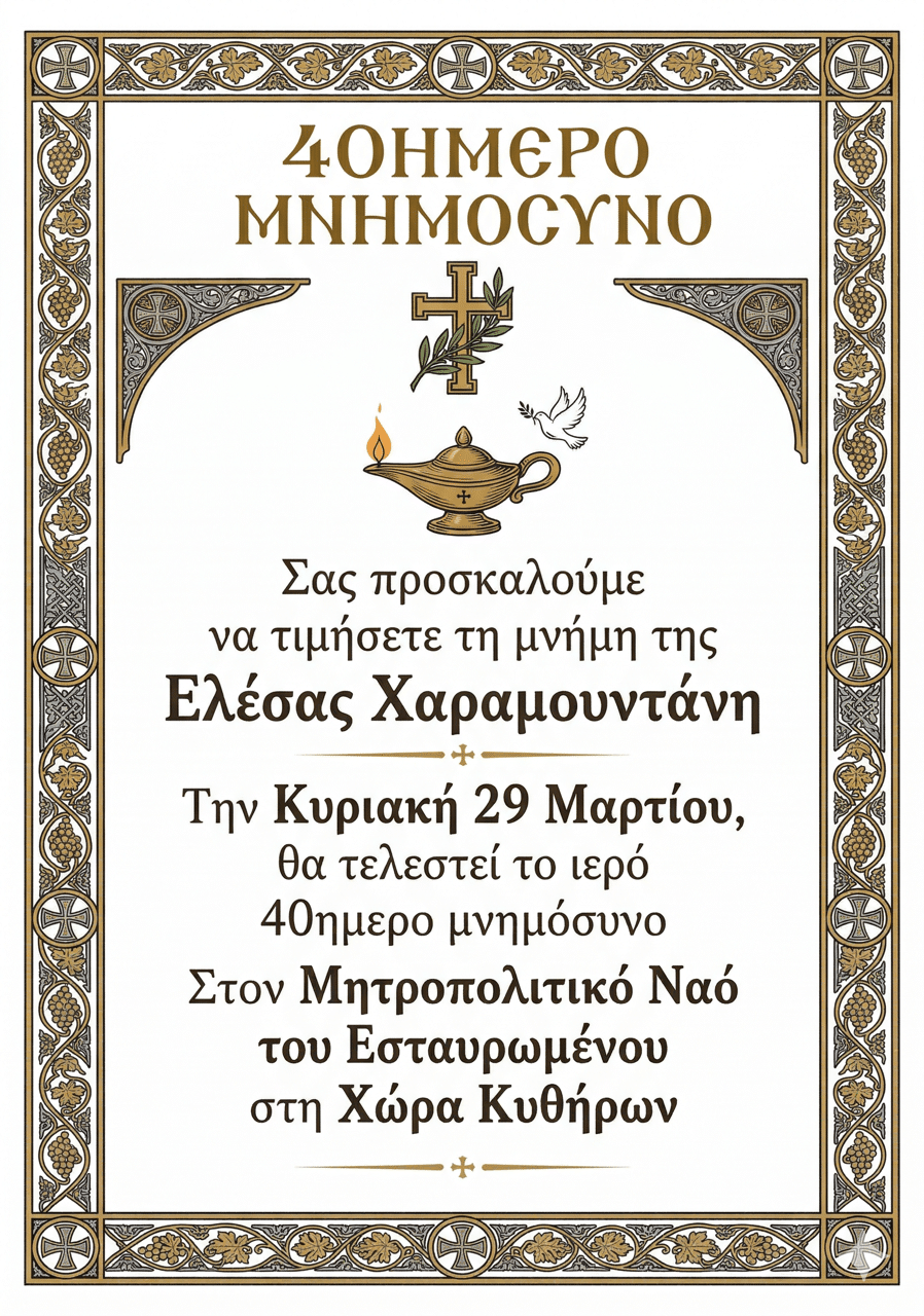 Την Κυριακή 29 Μαρτίου, θα τελεστεί το ιερό 40ήμερο μνημόσυνο Στον Μητροπολιτικό Ναό του Εσταυρωμένου στη Χώρα Κυθήρων