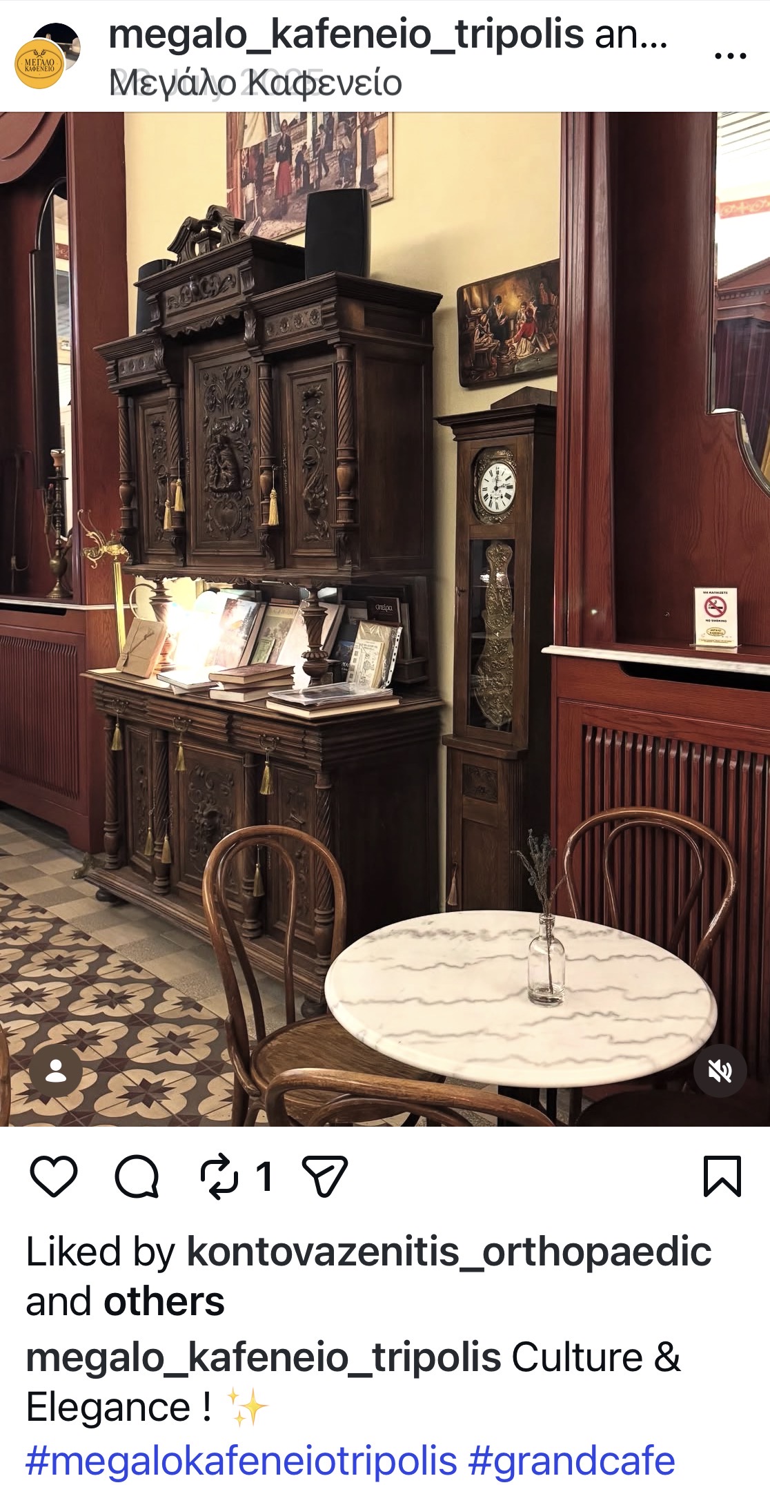 Στην καρδιά της Τρίπολης, στην πλατεία του Αγίου Βασιλείου, το Μεγάλο Καφενείο λειτουργεί αδιάλειπτα από το 1840, κουβαλώντας σχεδόν δύο αιώνες αστικής ιστορίας. Αγαπημένο στέκι της αριστοκρατίας της εποχής -γιατρών, δικηγόρων και εμπόρων- ο εσωτερικός του χώρος θυμίζει σήμερα περισσότερο μουσείο παρά καφενείο. Καθρέπτες με σκαλιστές κορνίζες, οβάλ τραπεζάκια, πολυτελείς καναπέδες και αυθεντικά έπιπλα από τη Βιέννη, κατασκευασμένα στο εργοστάσιο του Michael Thonet, συνθέτουν ένα σπάνιο σύνολο ιστορικής και αισθητικής αξίας. Σε ειδική προθήκη εκτίθενται όπλα της Επανάστασης του 1821, ενισχύοντας τη σύνδεση του χώρου με τη νεότερη ελληνική ιστορία.