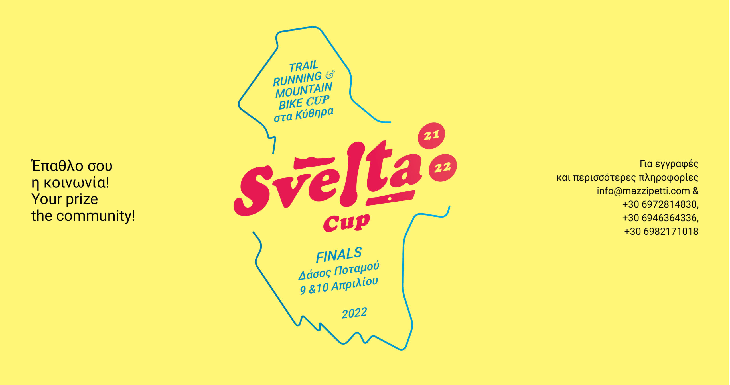 Το ποδηλατικό κατάστημα Mazzipetti και το Κυθηραϊκό Ίδρυμα Πολιτισμού και Ανάπτυξης (ΚΙΠΑ), σε συνεργασία με τον Πολιτιστικό Σύλλογο Πορτοκαλιά, τον Πολιτιστικό Σύλλογο Ποταμού και το Kythera Trails, υπό την αιγίδα του Δήμου Κυθήρων, διοργανώνουν τις τελικές εκδληλώσεις (αθλοπαιδίες/ποδηλατοβόλτα) -ορεινής ποδηλασίας και τρεξίματος ανωμάλου δρόμου- στον Ποταμό Κυθήρων.