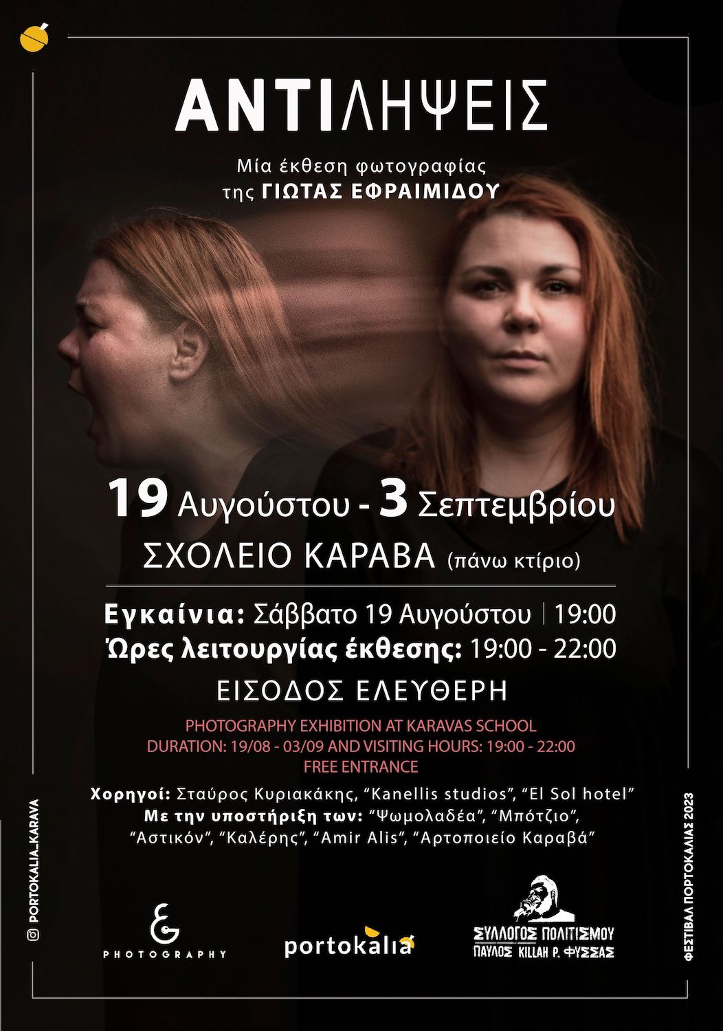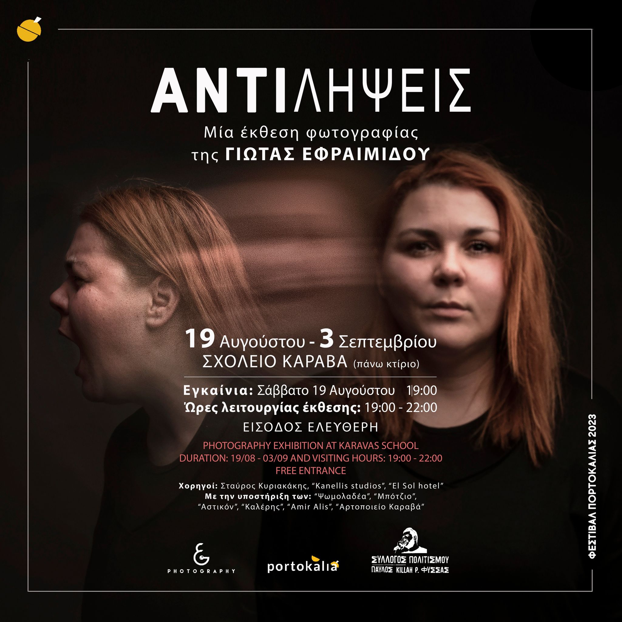 Το Φεστιβάλ Πορτοκαλιάς 2023 ανοίγει τις πόρτες του για την φετινή σεζόν φιλοξενώντας την πιο επίκαιρη από ποτέ, έκθεση φωτογραφίας της Γιώτας Εφραιμίδου, με τίτλο «ΑΝΤΙ ΛΗΨΕΙΣ». Η έκθεση πραγματοποιείται στα πλαίσια των δράσεων του Φεστιβάλ Πορτοκαλιάς 2023 από τον Πολιτιστικό Σύλλογο «Πορτοκαλιά Καραβά» σε συνεργασία με τον Σύλλογο Πολιτισμού «Παύλος Killah P Φύσσας» Η έκθεση εγκαινιάζεται το Σάββατο 19 Αυγούστου 2023 στις 19.00 παρουσία δυο εκ των πρωταγωνιστών της έκθεσης, της Μάγδας Φύσσα και του Ιάσονα Αποστολόπουλου, μαζί με άλλα μέλη του συλλόγου.