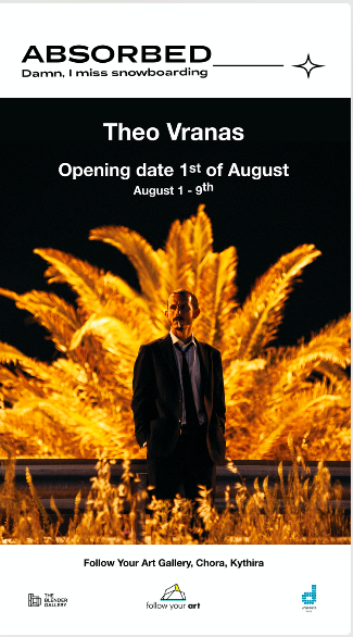 Follow Your Art gallery presents the solo exhibition of Theo Vranas entitled ABSORBED (Damn, I miss snowboarding). These new photo series shows the artist exploring the limits of self and mind, setting human struggles against beautiful landscapes. This particular work was presented for the first time in November 2023 at The Blender Gallery (Glyfada) and now continues its journey to the artist’s favorite place, Kythera, as a collaboration between the two art spaces.