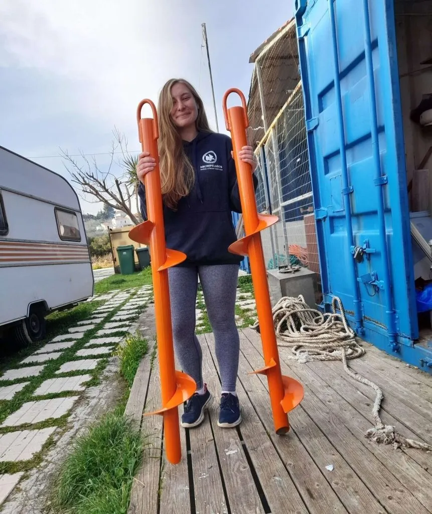 Έτσι αναπτύξαμε και κατασκευάσαμε πρωτότυπες αρίδες (ειδικές “βίδες”) 2 τύπων. Έχουν το κατάλληλο βήμα σπειρώματος και τις κατάλληλες διαστάσεις που απαιτούνται για εγκατάσταση στην παράκτια ζώνη στην Ελλάδα, σύμφωνα με τα γεωμορφολογικά χαρακτηριστικά και τη σύσταση του ιζήματος του θαλάσσιου πυθμένα. Επίσης κατασκευάσαμε και το απαραίτητο εργαλείο τοποθέτησης (μεγάλο υδραυλικό “κατσαβίδι” για υποβρύχια χρήση).