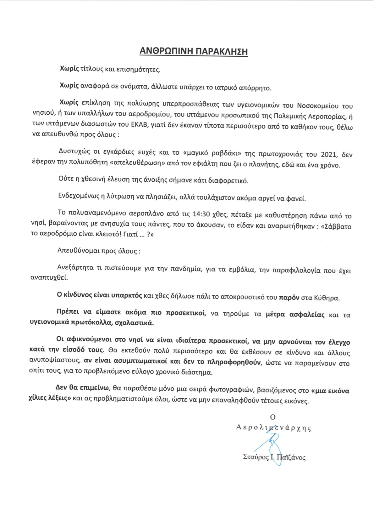 Αερολιμενάρχης ΚΑΚΘΩ: Ανθρώπινη παράκληση