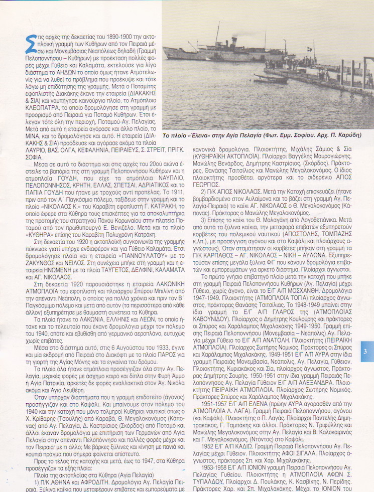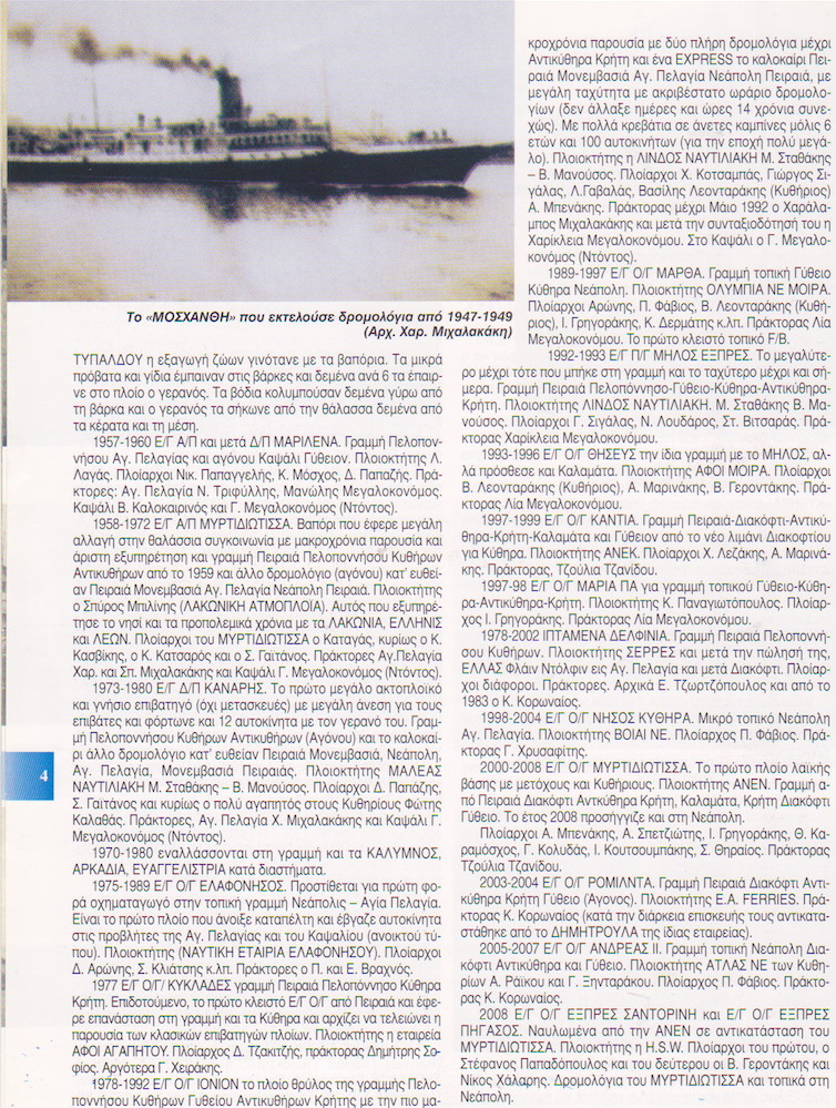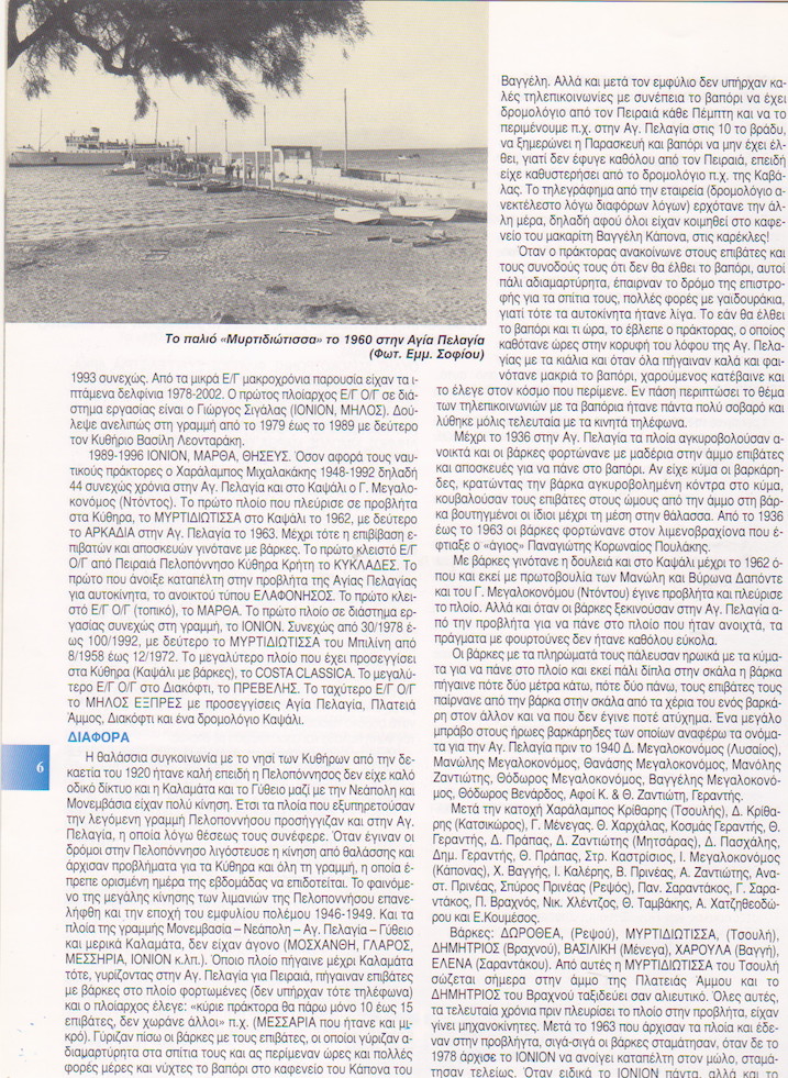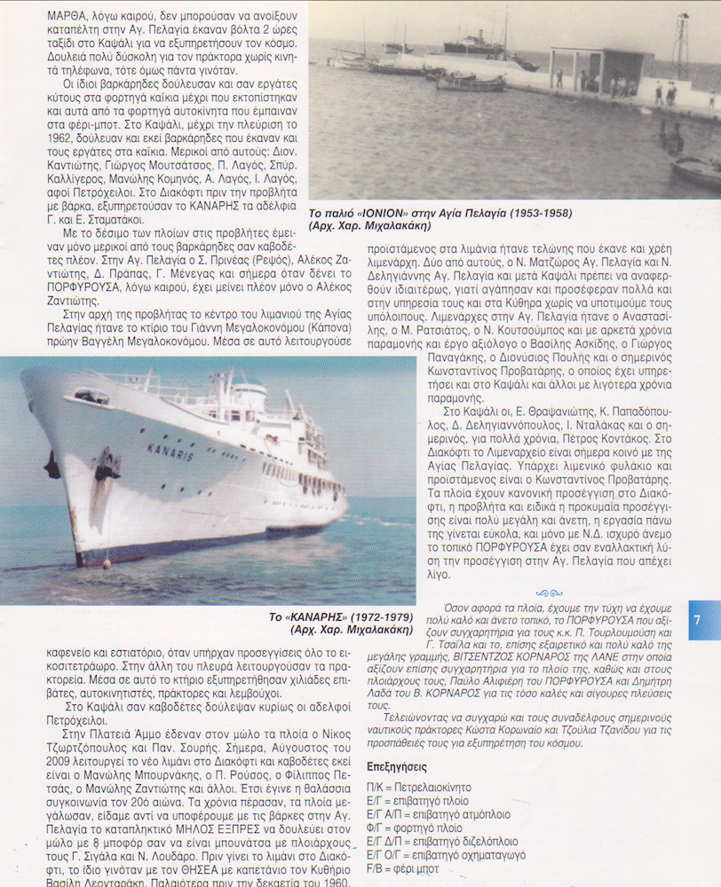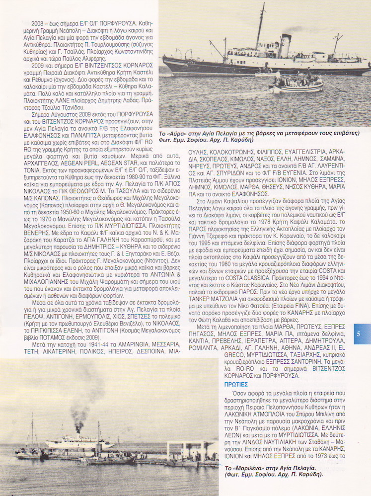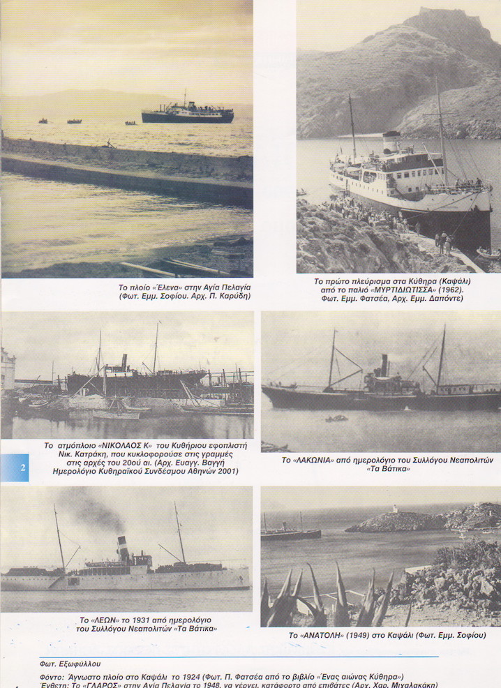 Στο όχι και πολύ μακρινό 2009 τα “Κ” είχαν δημοσιεύσει ένα αφιέρωμα στην Κυθηραϊκή Ακτοπλοΐα γραμμένο από το συνταξιούχο ναυτικό πράκτορα κ. Χαρ. Μιχαλακάκη, το οποίο προσφέρθηκε ως ένθετο στην εφημερίδα στους συνδρομητές της. Το φύλλο αυτό έγινε ανάρπαστο λόγω της διάσωσης σημαντικών στοιχείων από τον τρόπο και τα μέσα μετακίνησης επιβατών και εμπορευμάτων από το 1900 έως το 2009 και των σπάνιων φωτογραφιών, οι οποίες είχαν συμπεριληφθεί σε αυτό. Έτσι, εξαφανίστηκαν γρήγορα και τα λίγα επιπλέον αντίτυπα που είχαν τυπωθεί με τη χορηγία της ΚΥΘΗΡΑΪΚΗΣ ΑΔΕΛΦΟΤΗΤΟΣ ΑΘΗΝΩΝ ΠΕΙΡΑΙΩΣ.