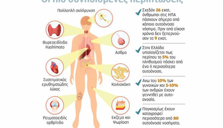 Mόνο στις ΗΠΑ σχεδόν 26 εκατομμύρια άνθρωποι πάσχουν σήμερα από κάποιο αυτοάνοσο νόσημα (από διαβήτη τύπου 1, ρευματοειδή αρθρίτιδα, θυρεοειδίτιδα Hashimoto και Graves, ψωρίαση, λεύκη μέχρι λύκο, σκληροδερμία και σκλήρυνση κατά πλάκας – έχουν περιγραφεί περισσότερα από 80 νοσήματα). Πριν από είκοσι χρόνια δεν ξεπερνούσαν τα 9 εκατομμύρια. Αντίστοιχη αύξηση παρατηρείται και στην Ευρώπη. Οι επιστήμονες μιλούν για επιδημία. Στη χώρα μας υπολογίζεται πως περίπου το 5% πάσχει από ένα ή περισσότερα αυτοάνοσα. Και το ποσοστό διαρκώς μεγαλώνει. Τι προκαλεί αυτή την έκρηξη; Ευθύνεται ο σύγχρονος τρόπος ζωής; Υπάρχει πρόληψη; Ζητήσαμε τη βοήθεια δύο διακεκριμένων επιστημόνων για να σχηματίσουμε το προφίλ των αυτοάνοσων νοσημάτων.