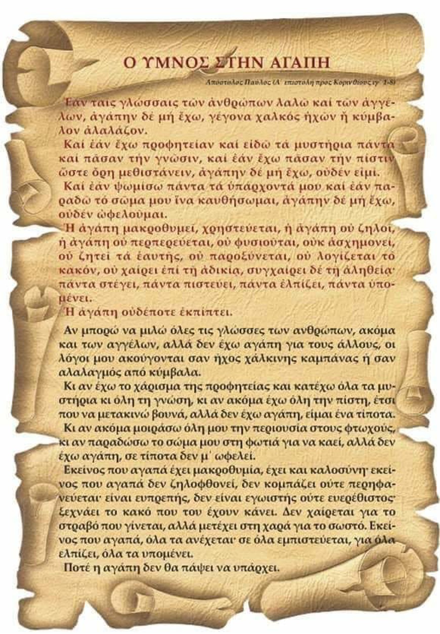 Τι καλύτερο γι’ αυτό από τον «Ύμνο της Αγάπης»-το απόσπασμα από την Επιστολή Α’ προς Κορινθίους του Αποστόλου Παύλου.