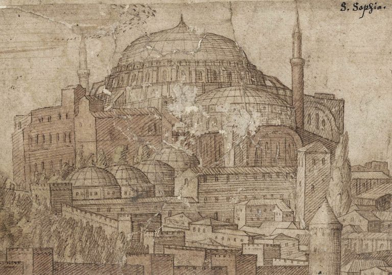Έτσι ήταν η Αγία Σοφία το 1559, μόλις έναν αιώνα μετά την δεύτερη Άλωση του 1453. Οι μεγαλύτερες καταστροφές έγιναν κατά την περίοδο των Σταυροφοριών και συγκεκριμένα κατά την περίοδο 1204-1261 όταν οι Φράγκοι έκαναν τον ναό Ρωμαιοκαθολικό. Η απεικόνιση είναι έργο του σπουδαίου χαράκτη της Αναγέννησης Μελχιώρ Λορκ.