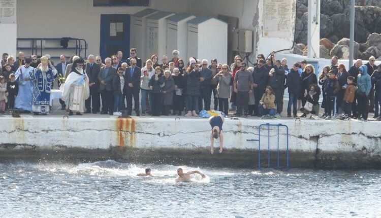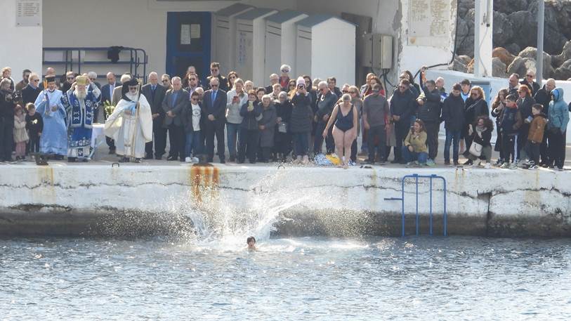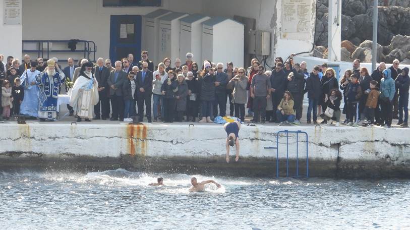 Ο σταυρός έπεσε στα κρυστάλλινα νερά και οι γενναίοι κολυμβητές και κολυμβήτριες βούτηξαν για να τον ανασύρουν, τηρώντας το έθιμο και ζητώντας ευλογία για τη νέα χρονιά.