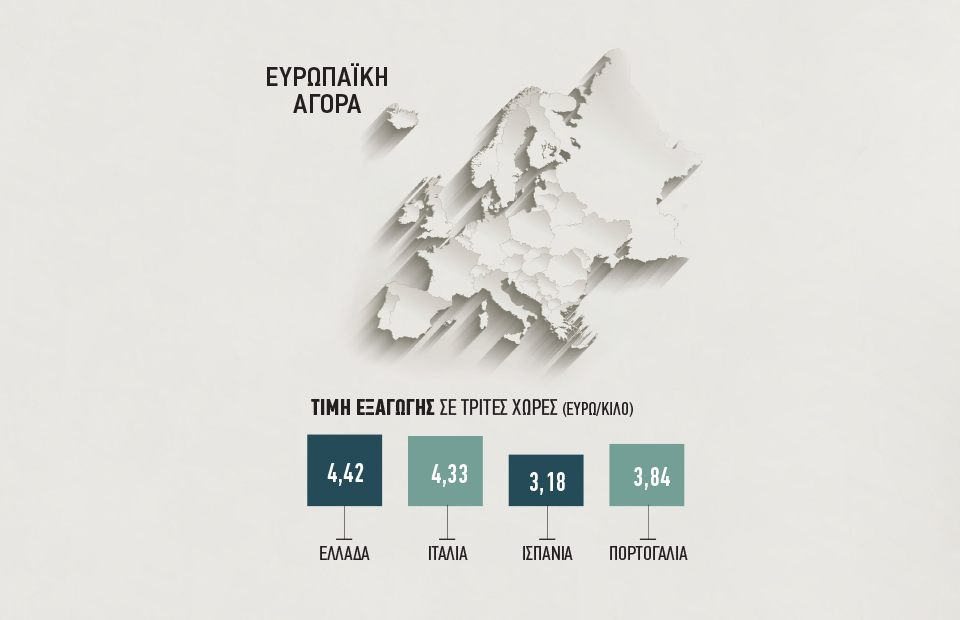 Με την πιο υψηλή τιμή εξαγωγής αναχωρεί το ελληνικό ελαιόλαδο για τις εξωκοινοτικές αγορές, στα 442 ευρώ ανά 100 κιλά, αφήνοντας πίσω Ιταλία, Ισπανία και Πορτογαλία, τη στιγμή όμως που το τονάζ των ελληνικών εξαγωγών έξτρα παρθένου, δεν είναι αρκετό για να καρπωθεί η εγχώρια παραγωγή το πριμ που διατίθενται να πληρώσουν οι Τρίτες Χώρες. Συνολικά δηλαδή η αξία εξαγωγών ευρωπαϊκού ελαιολάδου ανέρχεται σε 5,3 δισ. ευρώ περίπου, με τα ήμισυ του ποσού αυτού να το καρπώνεται η Ισπανία, όπως μαρτυρούν τα στοιχεία του IOC. Ανά χώρα, οι ισπανικές εξαγωγές ελαιολάδου έφτασαν τους 1.118.074 τόνους την περίοδο 2019/20 με εκτιμώμενη αξία 2,7962 δισ. ευρώ, τοποθετώντας την στην πρώτη θέση και ακολουθεί η Ιταλία με 355.358 τόνους και 1,3574 δισ. ευρώ. Έπεται η Πορτογαλία με 208.919 τόνους και 588,9 εκατ. ευρώ και στην τελευταία θέση βρίσκεται η Ελλάδα με 160.856 τόνους και 450,7 εκατ. ευρώ.
