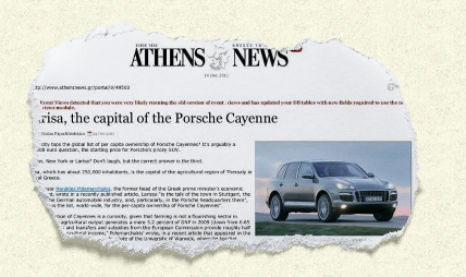 Το άρθρο, όπως αναδημοσιεύτηκε τότε από την ελληνική αγγλόφωνη εφημερίδα Athens News, ανέφερε μεταξύ άλλων ότι η Λάρισα ήταν «το θέμα συζήτησης στη Στουτγάρδη, στο λίκνο της γερμανικής αυτοκινητοβιομηχανίας, και, ειδικότερα, στην έδρα της Porsche» συνδέοντας εμμέσως πλην σαφώς την κατά κεφαλήν ιδιοκτησία Porsche Cayenne στην περιοχή της Λάρισας με τις αγροτικές επιδοτήσεις από την Ευρωπαϊκή Επιτροπή.
