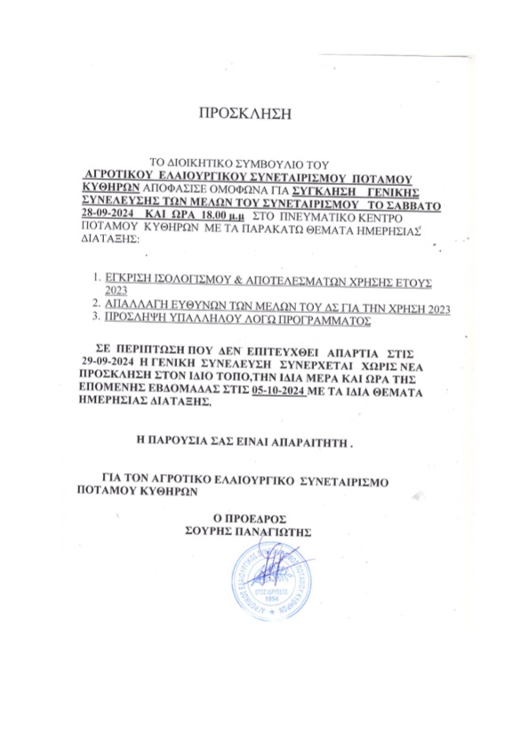 ΑΓΡΟΤΙΚΟΣ ΕΛΑΙΟΥΡΓΙΚΟΣ ΣΥΝΕΤΑΙΡΙΣΜΟΣ ΠΟΤΑΜΟΥ ΚΥΘΗΡΩΝ – Πρόσκληση για Γενική Συνέλευση