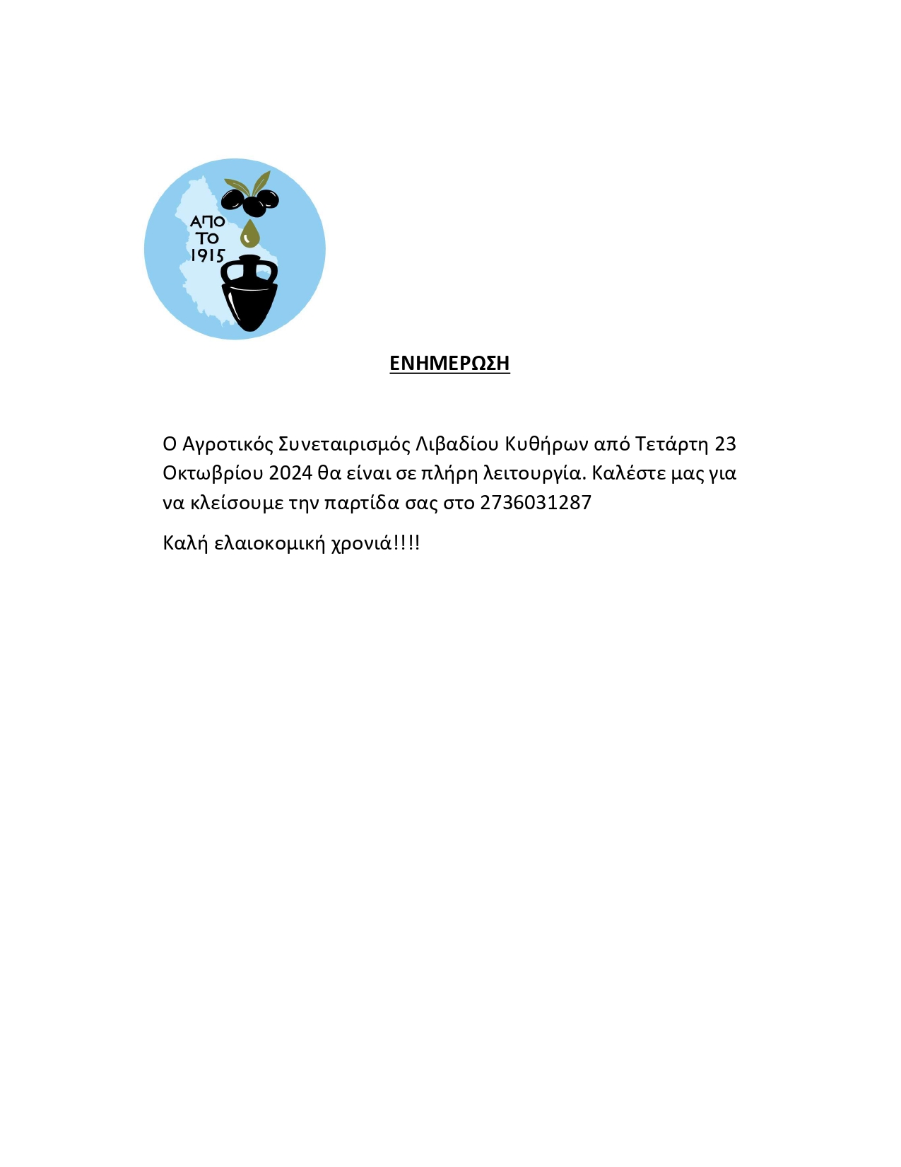 Αγροτικός Συνεταιρισμός Λιβαδίου Κυθήρων – Έναρξη ελαιοκομικής περιόδου 2024-25