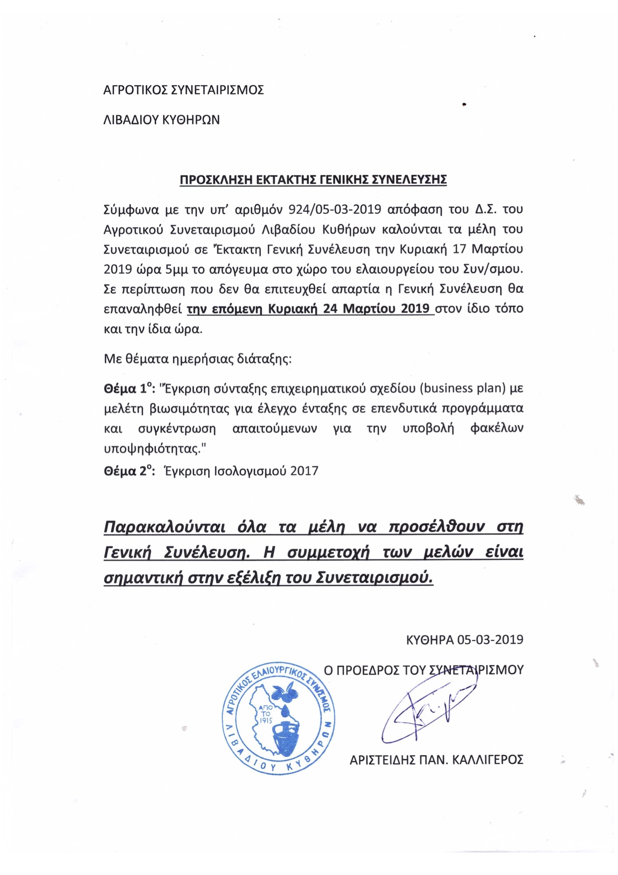 Αγροτικός Συνεταιρισμός Λιβαδίου Κυθήρων – Πρόσκληση Έκτακτης Γενικής Συνέλευσης