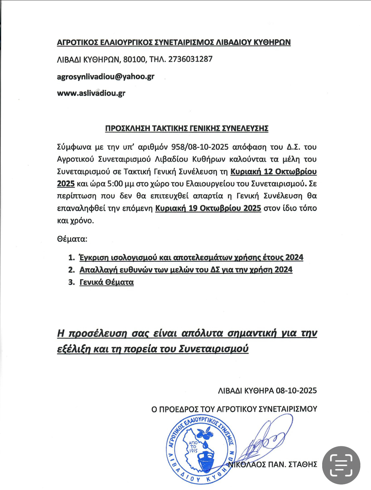 - Αγροτικός Συνεταιρισμός Λιβαδίου Κυθήρων – ΠΡΟΣΚΛΗΣΗ ΓΕΝΙΚΗΣ ΣΥΝΕΛΕΥΣΗΣ 2025