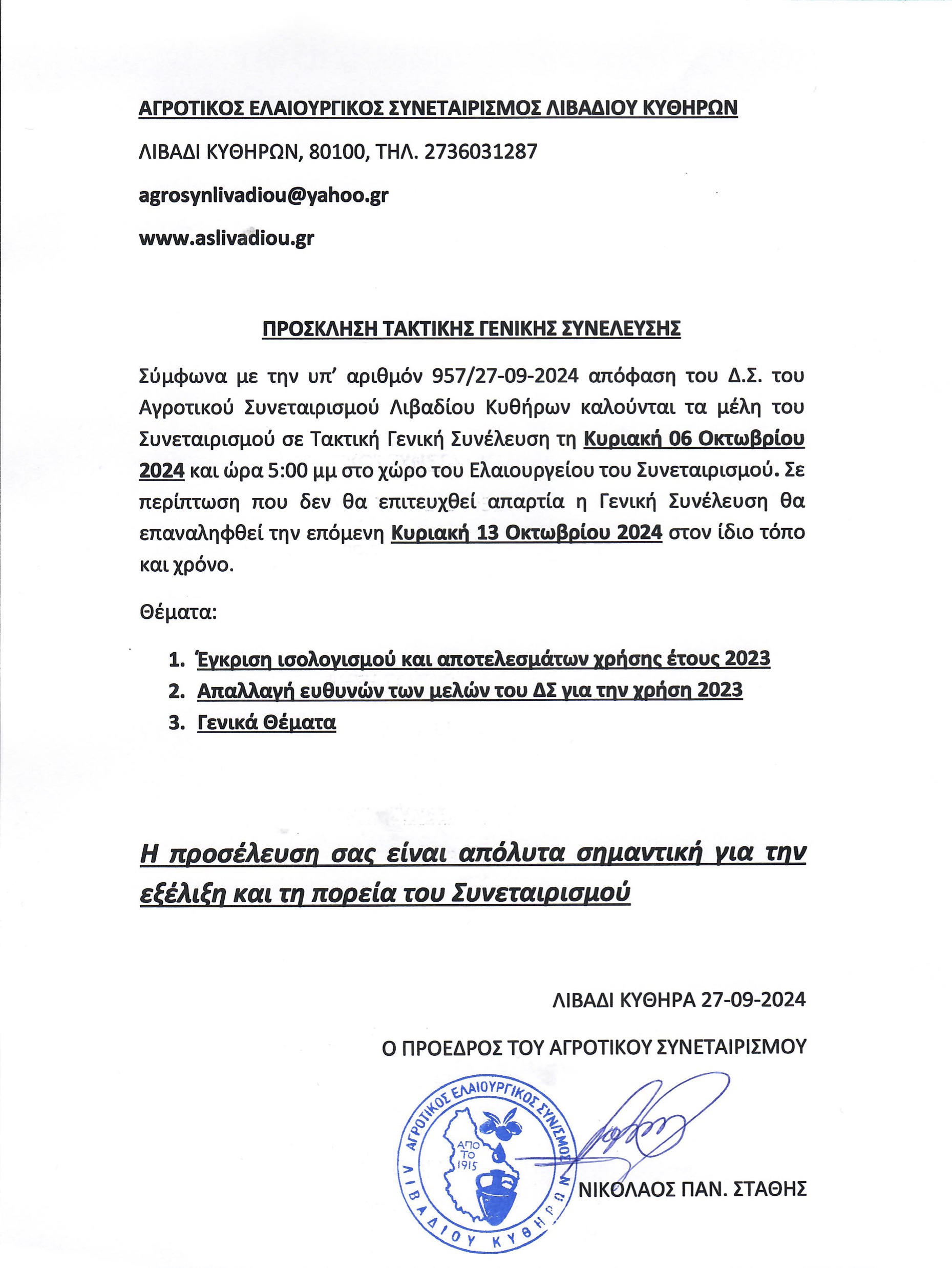 Αγροτικός Συνεταιρισμός Λιβαδίου Κυθήρων – Πρόσκληση σε Γενική Συνέλευση 2024