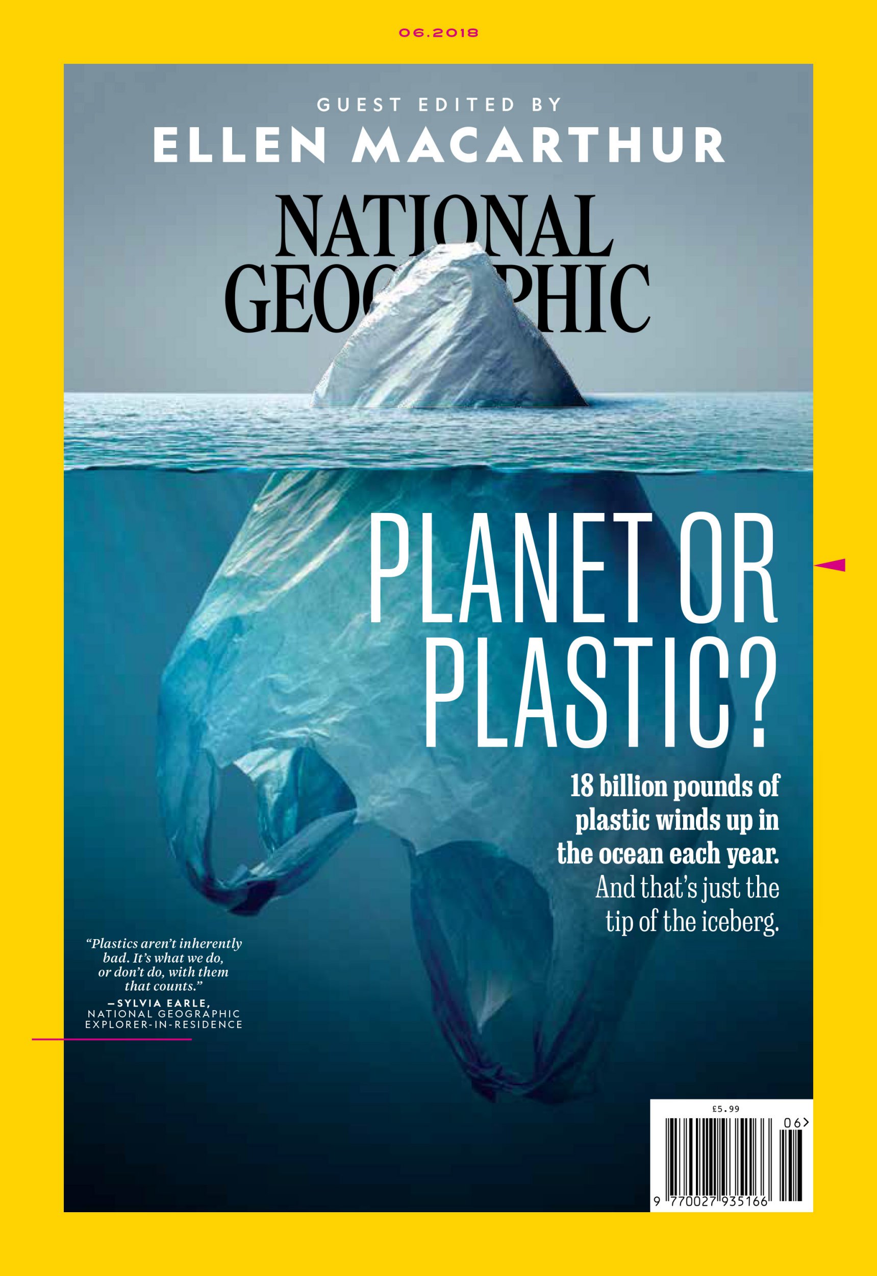 «Πλανήτης ή πλαστικό;» είναι το ερώτημα που θέτει το περιοδικό στον τίτλο του για να αποκαλύψει στη λεζάντα ότι τα δισεκατομμύρια κιλά πλαστικού που καταλήγουν κάθε χρόνο στον ωκεανό είναι απλά «η κορυφή του παγόβουνου».