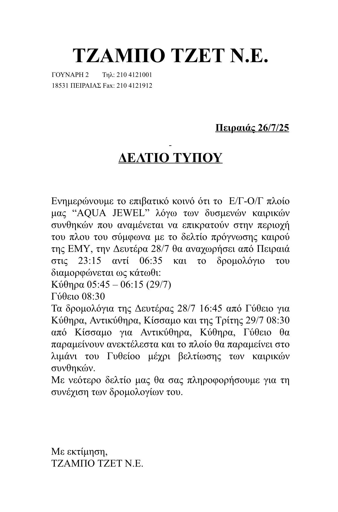 Αλλαγή δρομολογίων AQUA JEWEL για τη Δευτέρα 28/7/2025 λόγω καιρικών συνθηκών