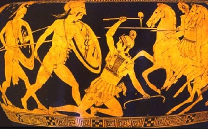 Μάχη Ελλήνων και Αμαζόνων σε αττικό αγγείο, οι τελευταίες διακρίνονται με ποικιλία οπλισμού μικτής προέλευσης