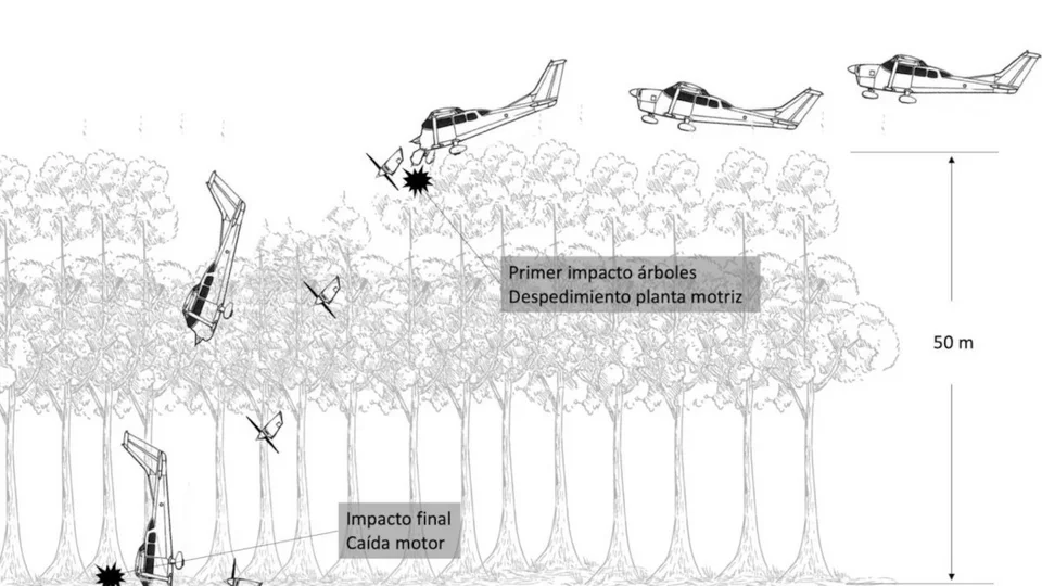 «Λεπτομερής επιθεώρηση των συντριμμιών έδειξε ότι, κατά τη διάρκεια της προσγείωσης, υπήρξε μια πρώτη πρόσκρουση στα δέντρα. Αυτό το χτύπημα προκάλεσε τον διαχωρισμό του κινητήρα με το κάλυμμά του και της προπέλας από τη δομή του αεροσκάφους», αναφέρει η έκθεση. «Εξαιτίας της έντονης επιβράδυνσης και της απώλειας ελέγχου κατά την πρώτη πρόσκρουση, το αεροσκάφος έπεσε κάθετα και συγκρούστηκε με το έδαφος».