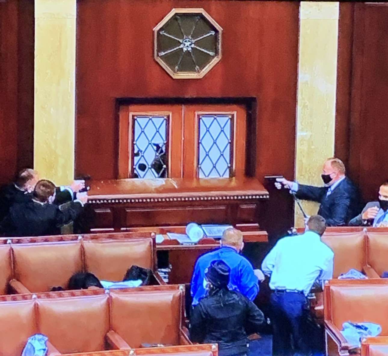 Οι διαδηλωτές άκουσαν. Ενθαρρύνθηκαν από τους ομιλητές —η Ιβάνκα Τραμπ χαρακτήρισε τους εισβολείς «πατριώτες» προτού σβήσει το tweet. O όχλος έσπασε την κεντρική πόρτα του Καπιτωλίου και τα παράθυρα και εισέβαλε στον χώρο υποδοχής. Οι βουλευτές και οι γερουσιαστές αποσύρθηκαν τρομοκρατημένοι σε άλλο χώρο του κτιρίου για λόγους ασφαλείας. Η αστυνομία τους έδωσε εντολή να φύγουν από άλλη πλευρά ώστε να μπορέσει να διώξει τους εισβολείς.