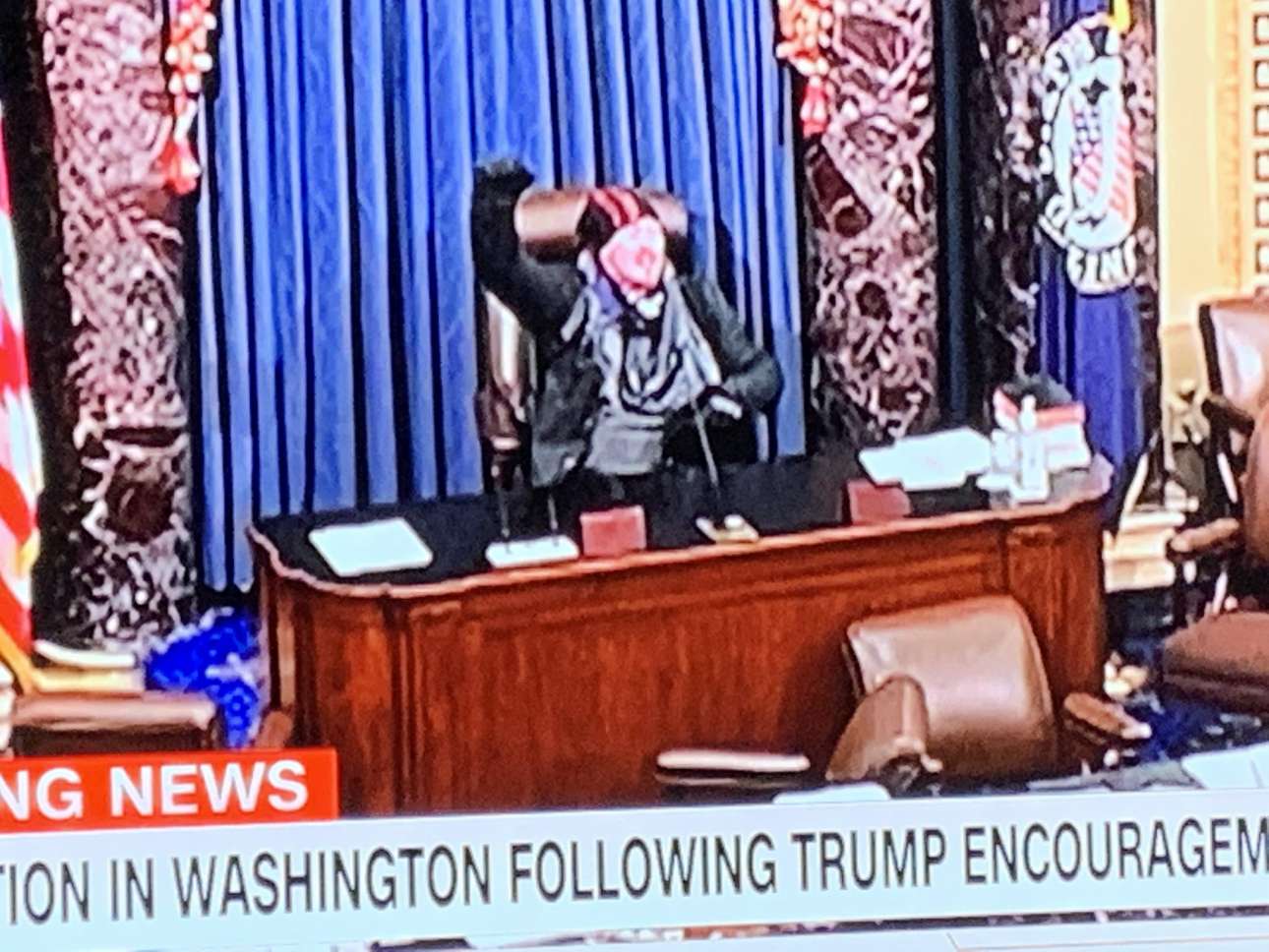 Ένας από τους εισβολείς ποζάρει στο γραφείο της προέδρου της Βουλής των Αντιπροσώπων Νάνσι Πελόζι (EPA)