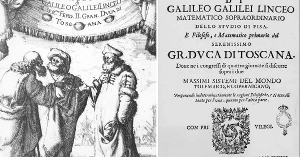 Στις 22 Φεβρουαρίου του 1632 τυπώθηκε στη Φλωρεντία ο «Διάλογος σχετικά με τα δύο παγκόσμια συστήματα» του Γαλιλαίου (αναφέρεται στο Πτολεμαϊκό και το Κοπερνίκειο). Στο κείμενο αυτό ο Γαλιλαίος υπερασπίστηκε το ηλιοκεντρικό σύστημα, που είχε προτείνει μερικά χρόνια πριν ο Κοπέρνικος, ανασύροντας από τη λήθη τις ηλιοκεντρικές θεωρίες Πυθαγόρειων όπως του Αρίσταρχου του Σάμιου. Κι αυτό το έκανε αριστοτεχνικά χρησιμοποιώντας το λογοτεχνικό είδος του διαλόγου (γνωστό από την κλασική φιλοσοφική γραμματεία).