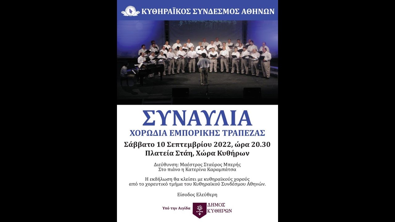 Η συναυλία που διοργανώνει ο Κυθηραϊκός Σύνδεσμος Αθηνών το Σάββατο 10 Σεπτεμβρίου και ώρα 20.30στην πλατεία της Χώρας Κυθήρων, υπό την αιγίδα του Δήμου Κυθήρων, θα μεταδοθεί απευθείας ακολουθώντας τον παρακάτω σύνδεσμο :