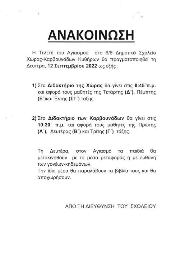 - Ανακοίνωση Αγιασμού Δημοτικού Σχολείου Χώρας-Καρβουνάδων