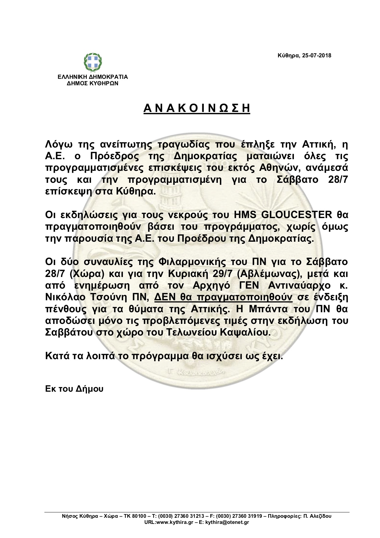 Ανακοίνωση Δήμου Κυθήρων για τις εκδηλώσεις για τους νεκρούς του HMS GLOUCESTER