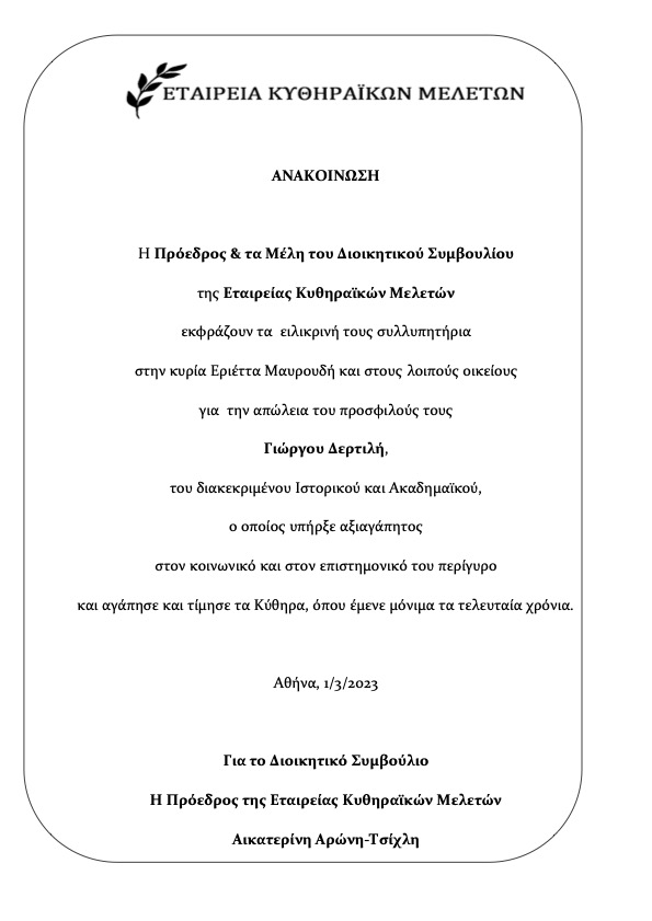 - Ανακοίνωση εις μνήμην Γιώργου Δερτιλή