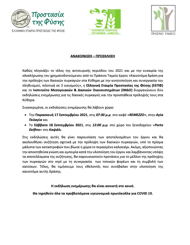 Ανακοίνωση – Ελληνική Εταιρία Προστασίας της Φύσης – Πρόσκληση Εκδηλώσεων / Κύθηρα 17 και 18 Σεπτεμβρίου 2021