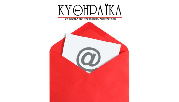 Επειδή τον τελευταίο καιρό παρατηρούνται προβλήματα με την αποστολή και λήψη μηνυμάτων ηλεκτρονικού ταχυδρομείου, ενημερώνουμε όσους επιθυμούν να επικοινωνήσουν μαζί μας, να χρησιμοποιούν, εκτός από τη γνωστή διεύθυνση editor@kythiraika.gr και την efimerida@kythiraika.gr