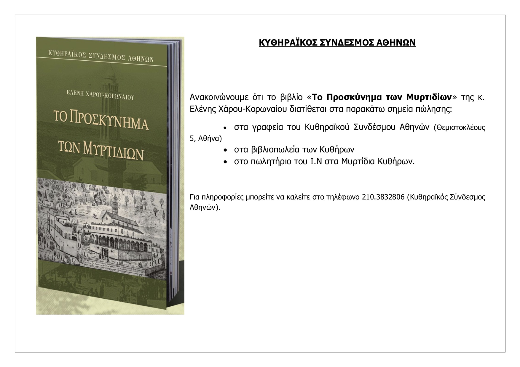 Ανακοίνωση Κυθηραϊκού Συνδέσμου για το βιβλίο «Το Προσκύνημα των Μυρτιδίων»
