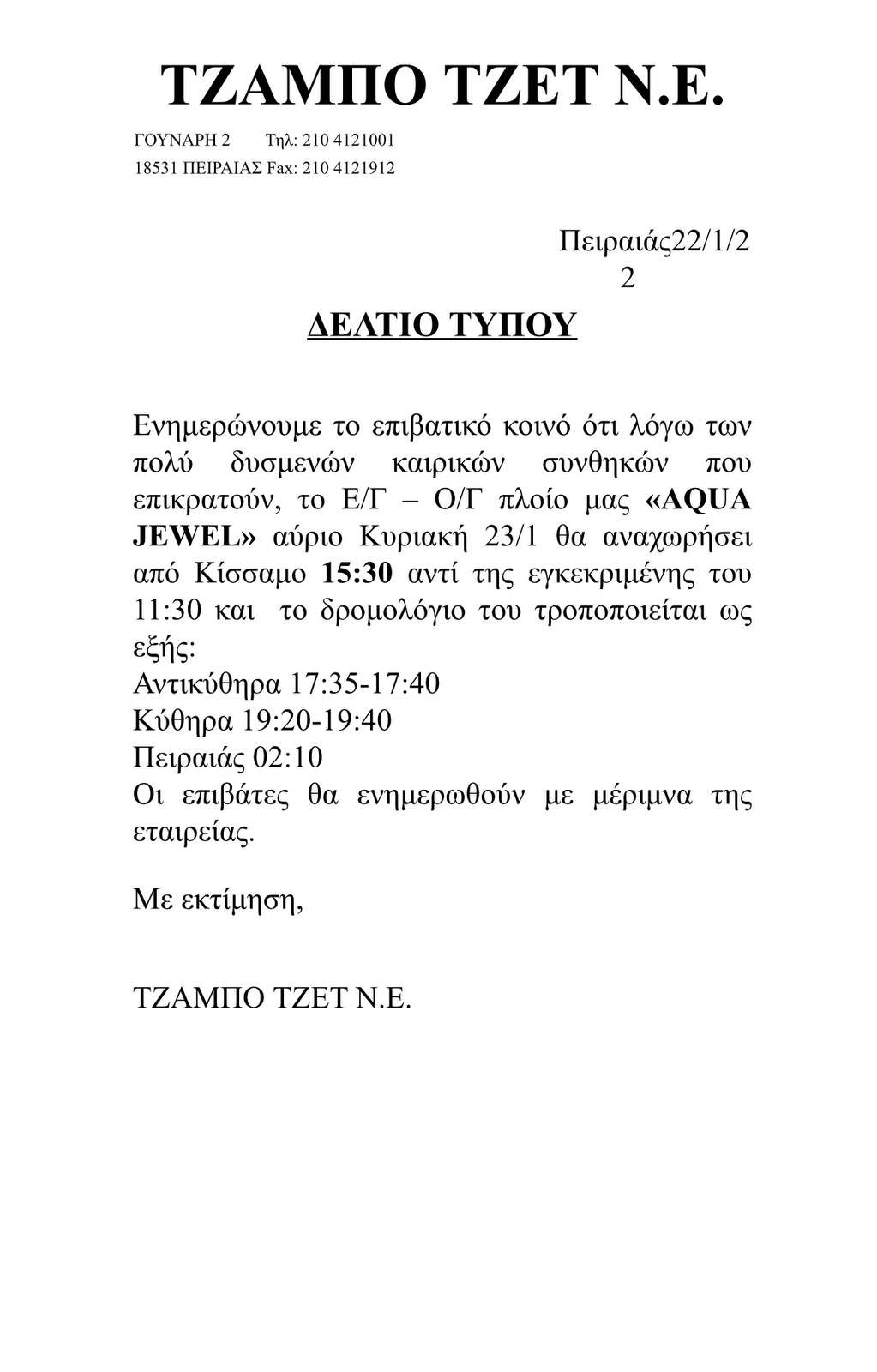 - Ανακοίνωση Seajets – Τροποποίηση δρομολογίου Aqua Jewel