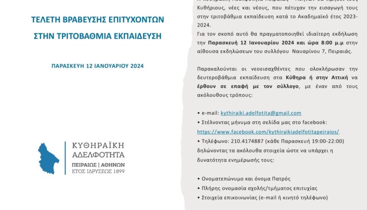 H Κυθηραϊκή Αδελφότητα Πειραιώς – Αθηνών θα τιμήσει τους Κυθήριους, νέες και νέους, που πέτυχαν την εισαγωγή τους στην τριτοβάθμια εκπαίδευση κατά το Ακαδημαϊκό έτος 2023-2024.