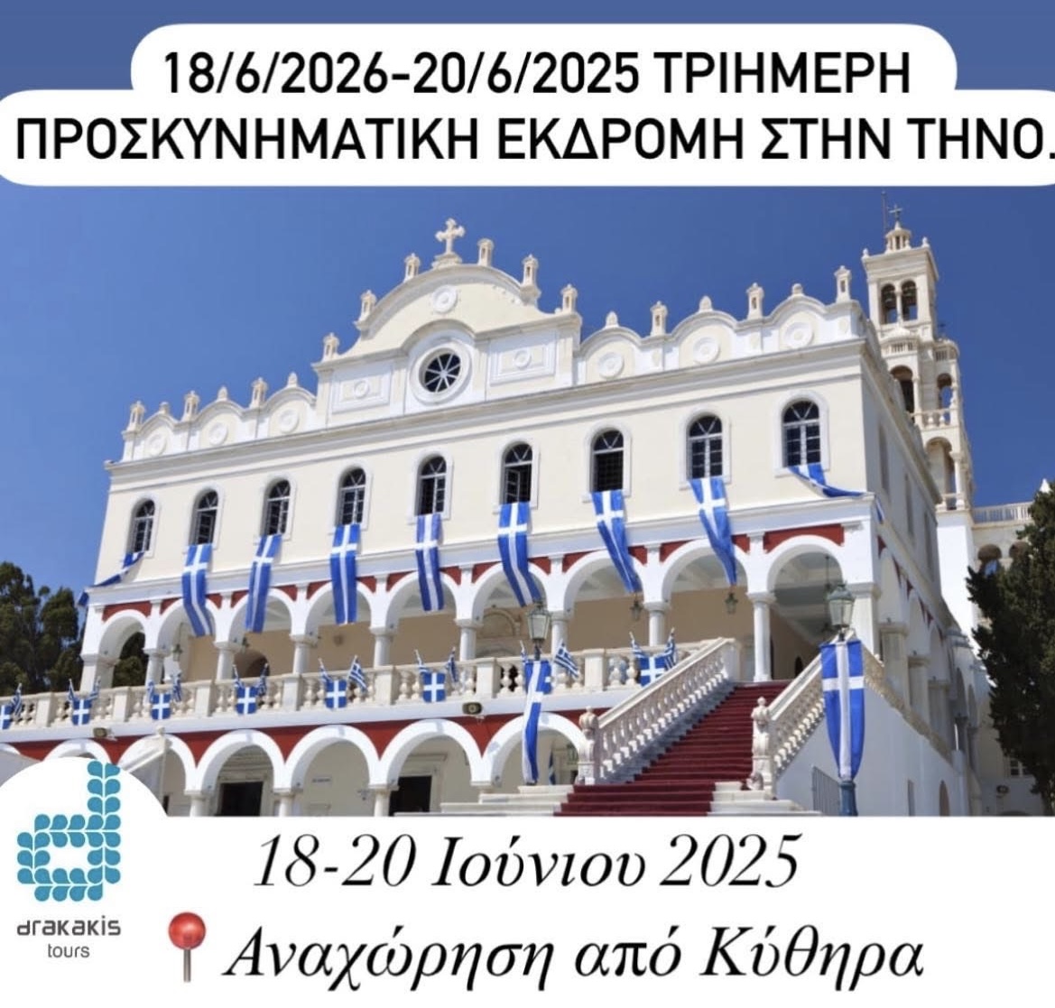 Με ιδιαίτερη χαρά σας προσκαλούμε στην Τριήμερη Προσκυνηματική Εκδρομή του γραφείου μας από τα Κύθηρα στην Τήνο, από 18 έως 20 Ιουνίου 2025!