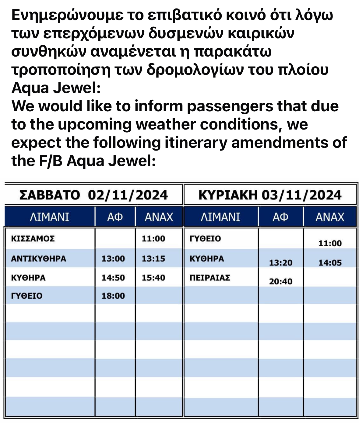 ‼️ΟΡΘΗ ΕΠΑΝΑΛΗΨΗ στην προηγούμενη ανακοίνωση , το δρομολόγιο της 3/11 Από Γύθειο για Κύθηρα αναχωρεί στις 11:45’ ενώ από Κύθηρα για Πειραιά στις 14:45’