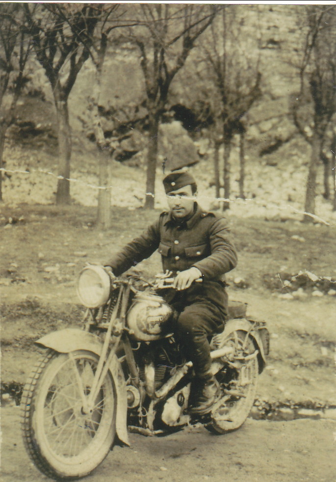 Ένας φαντάρος από τα Κύθηρα, ο αείμνηστος Γιάννης Λευθέρης-Φοντάν φωτογραφίζεται στην Πρεμετή κοντά στο μέτωπο στον Ελληνοϊταλικό πόλεμο του 1940. Η μοτοσυκλέτα είναι μία ARIEL μοντ. 1938 (;) Αγγλική, αλλά λάφυρο από τους Ιταλούς. Με την κατάρρευση του μετώπου ο αναβάτης της, τραυματίας τότε, βρέθηκε σε Νοσοκομείο στα Γιάννενα και με την ανάρρωσή του και έπειτα από χίλιες δυσκολίες έφθασε στην Αθήνα και αργότερα στα Κύθηρα, στα οποία έφερε και τη μοτοσυκλέτα αυτήν.