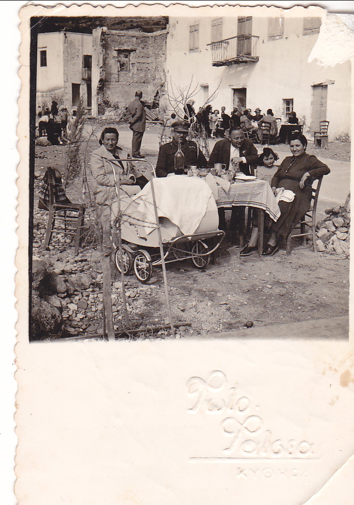 Γύρω στο 1950 είναι και αυτή η φωτογραφία του Εμμ. Φατσέα με δύο οικογένειες να απολαμβάνουν ένα γεύμα έξω, άρα έχουμε άνοιξη ή καλοκαίρι. Η μία είναι η οικογένεια του καθηγητή των καλλιτεχνικών Ι. Σπηλιόπουλου, από το αρχείο του οποίου και προέρχεται. Προσέξτε το καροτσάκι με το μωρό. Η άλλη ίσως είναι οικογένεια αξιωματικού της Χωροφυλακής. Αυτό που έχει σημασία είναι το τοπίο γύρω, το οποίο μας είναι άγνωστο. Πιθανόν να είναι στο Καψάλι. Προσέξτε το κατεστραμμένο κτήριο πίσω, τα μπαλκόνια στα διώροφα και οι οικογένειες που απολαμβάνουν ένα πρόχειρο (;) γεύμα σε τραπεζάκια, αλλά δεν γνωρίζουμε αν πρόκειται για κάποια ταβέρνα ή καφενείο. Αν κάποιος γνωρίζει το χωριό θα είχε ενδιαφέρον.