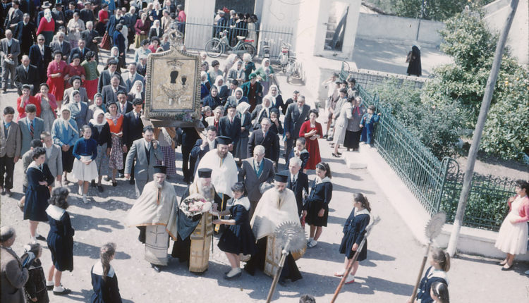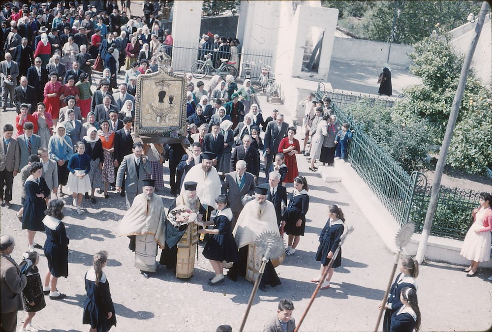 Εμπρός από την εικόνα της Παναγίας ο Μητροπολίτης Μελέτιος δέχεται μία ανθοδέσμη από ένα κορίτσι. Δεξιά του ο παπά Μανώλης Ζερβός και αριστερά ο παπά Ηλίας Χανιώτης και πίσω ο παπά Γιώργης Λουράντος, ενώ αναγνωρίζονται και πολλοί από τον κόσμο που συνοδεύει την εικόνα, καθώς η φωτογραφία είναι μόνο (!) 60 χρόνων πάνω κάτω. (Φωτ. Γ. Ποτήρης από το αρχείο του Μάνου Ζερβού).