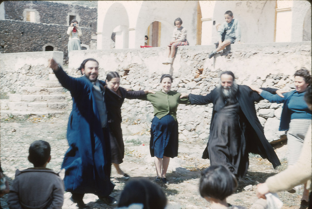 Εδώ μία Καθαρή Δευτέρα (με σχετική επιφύλαξη αυτό) στο μοναστήρι των Αγίων Αναργύρων στο Ξερουλάκι, να διακρίνονται στο χορό οι αείμνηστοι ιερείς παπά Σταύρος Χάρος και παπά Γιώργης Μεγαλοκονόμος-Μεταξάς.