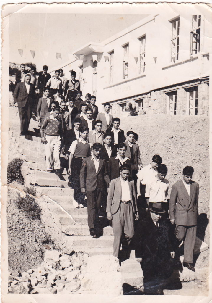Εδώ μία ομάδα μαθητών κατεβαίνει τη γνωστή σκάλα, στην οποία είχαν τραβηχτεί οι περισσότερες αναμνηστικές φωτογραφίες των γυμνασιακών μας χρόνων. Προφανώς σε κάποια εθνική εορτή οι νεαροί (στη φωτογραφία είναι μόνο αγόρια) κατεβαίνουν τη σκάλα, ενώ διακρίνονται και δύο καθηγητές τους. Δεν έχουμε καμία πληροφορία σχετικά με τη χρονολογία και τους εικονιζόμενους, γι’ αυτό κάθε πληροφορία ευπρόσδεκτη.
