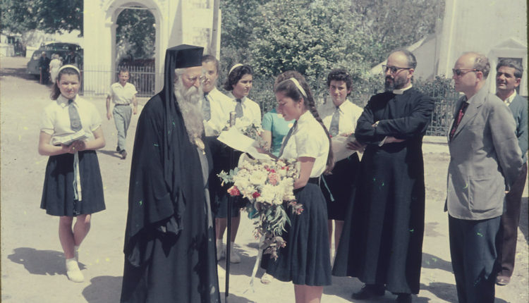 Από τη Γύρα της Μυρτιδιώτισσας και αυτή η φωτογραφία, καίτοι εδώ δεν φαίνεται η εικόνα, αλλά συνάγεται από άλλες φωτογραφίες. Πρέπει να είναι το 1960 και μία μαθήτρια παραδίδει μία ανθοδέσμη στο Μητροπολίτη Μελέτιο (Γαλανόπουλο) υπό τα βλέμματα του Γεωργίου Κόκσμα του Παγκοσμίου Συμβουλίου Εκκλησιών και ενός ιερέα, τον οποίο δεν γνωρίζουμε, καθώς δεν φαίνεται να είναι από τα Κύθηρα, ενώ πιθανόν να είναι από Ορθόδοξη εκκλησία της Διασποράς. Δίπλα μερικές ακόμη μαθήτριες με εορταστική ενδυμασία. Από τη γνωστή συλλογή Ποτήρη και αυτή η φωτογραφία.