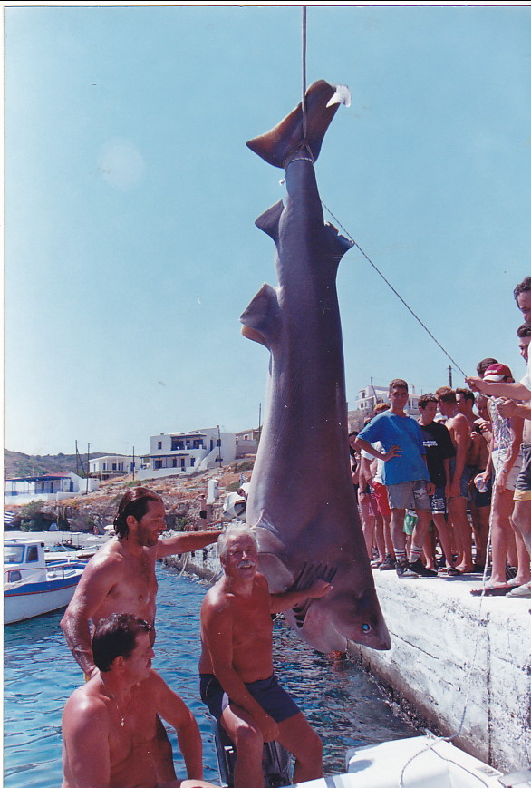 Στην Πλ. Άμμο τον Αύγουστο του 1999 βρέθηκαν μερικοί φίλοι και το έριξαν στο ψάρεμα. Πόσο γνώριζαν από ψάρια το αποδεικνύει η συνέχεια. Σχεδόν με την πρώτη τους έξοδο κατάφεραν και έπιασαν το θηρίο που βλέπετε. Περιχαρείς το έβγαλαν στην παραλία κι εκεί ρωτούσαν να μάθουν τι είναι. Ο ένας τους έλεγε το μακρύ του, ο άλλος το κοντό του και οι πληροφορίες έλεγαν τότε ότι οι νέοι ψαράδες μας πείστηκαν στα λόγια ….ειδήμονος που τους είπε ότι το ψάρι είναι Σαπουνάς (ένα καρχαριοειδές που δεν τρώγεται) και το πέταξαν.