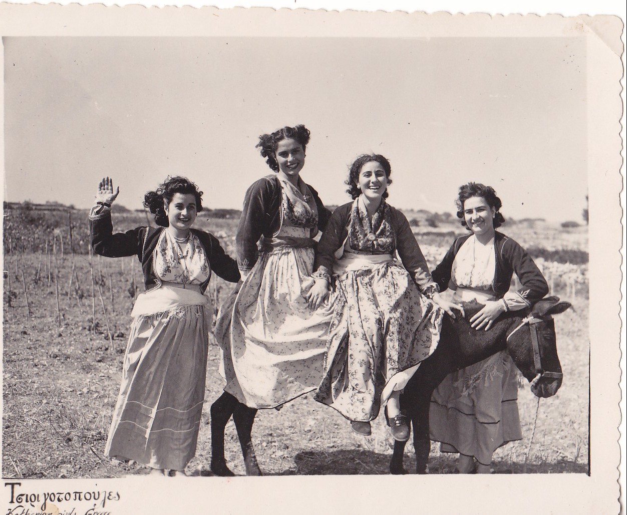 Πάλι από το αρχείο Σπηλιόπουλου, μία γνωστή πόζα του αείμνηστου Εμμ. Σοφίου. Τέσσερις πανέμορφες κοπέλες φωτογραφίζονται με τοπική ενδυμασία (σπαλέτο). Άλλες πληροφορίες δεν έχουμε, αρκεί όμως το χαμόγελο των κοριτσιών, αυτό που πάντα προσήλκυε τ’ αγόρια και έδινε το άλας της ζωής.