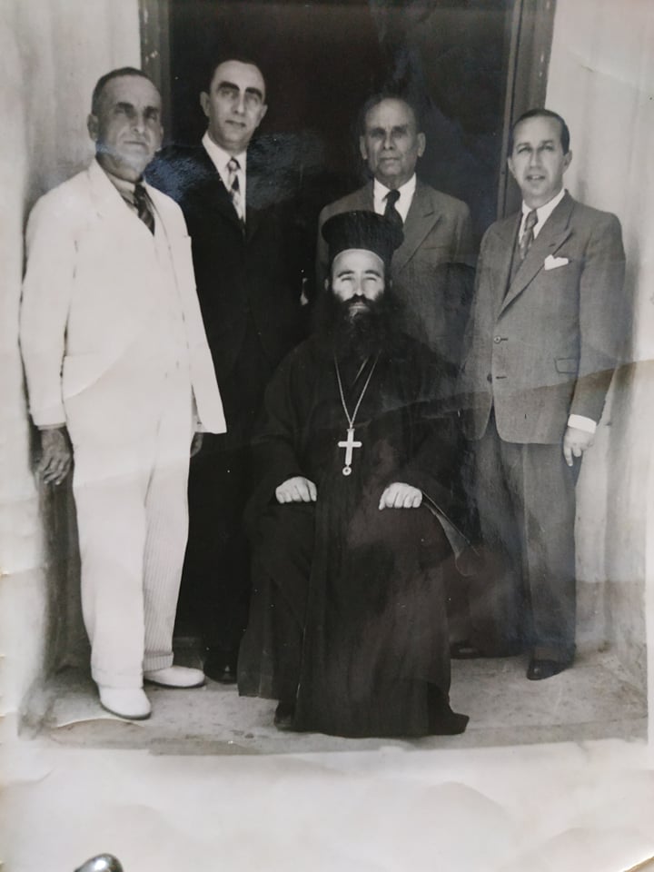 Μία φωτογραφία από το πλούσιο αρχείο της Ελένης Χάρου-Κορωναίου. Είναι στη δεκαετία του 1950 και διακρίνονται, από αριστερά: Ιωάννης Μπαγκής, Σοφοκλής Καλούτσης, Άγγελος Κασιμάτης και Θεόδωρος Αρώνης. Καθιστός μπροστά ο παπά-Σταύρος Χάρος.